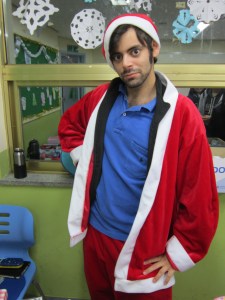 Last friday, my school had its annual Christmas party for the children, and I was coerced into dressing up as Santa Claus. Actually, that’s a bit misleading. I was coerced into wearing holiday-themed pajamas/dressing up like a criminal doing community service. Here’s a mug shot: